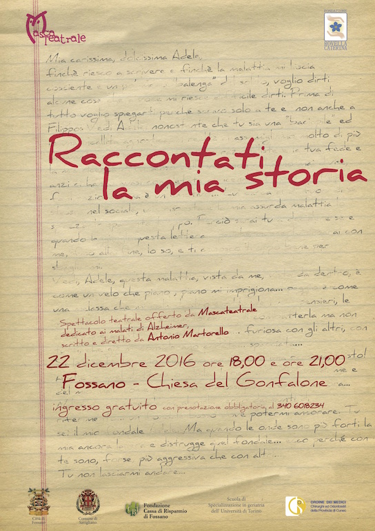 Giovedì 22 dicembre, nella chiesa del Gonfalone (Battuti bianchi), alle 18 e alle 21, andrà in scena la “prima” dello spettacolo sull’Alzheimer (“Raccontati la mia storia”) scritto e diretto da Antonio Martorello, voluto dalla Fondazione Rovella, la fondazione nata in memoria di Caterina Rovella che opera a sostegno dei malati di Alzheimer e dei loro famigliari.