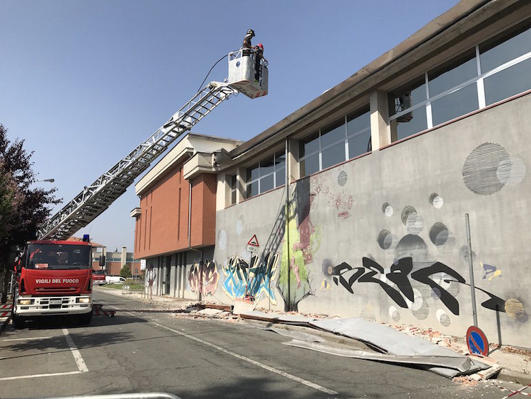 Crollo di un lungo tratto di cornicione della palestra dell’Istituto Vallauri di Fossano. È successo questa mattina, mercoledì 2 agosto, intorno alle 10. Il lato interessato dal crollo è quello che affaccia su via San Michele. Il cornicione realizzato in cemento armato ha ceduto improvvisamente. Sopra di esso poggiava un parapetto in mattoni ricoperto da lamiere, che è caduto a terra invadendo il marciapiede sottostante. Fortunatamente in quel momento nessun pedone stava transitando. Sul posto i carabinieri di Fossano, i vigili del fuoco di Fossano e di Cuneo che stanno facendo le prime verifiche, e gli agenti della Polizia locale di Fossano. Tra i primi ad arrivare sul posto anche il vicesindaco Vincenzo Paglialonga. “La palestra risale almeno ad una trentina di anni fa – spiega – ora occorrerà fare tutti i controlli del caso, per capire cosa è successo e se ci sono altre parti della copertura compromesse”. La competenza di tali controlli è della Provincia, proprietaria dell’immobile. Prima di rimuovere le macerie sarà necessario anche mettere in sicurezza il cornicione, facendo cadere la parte in cemento armato ancora attaccata alla copertura. La strada, via San Michele, è stata chiusa al traffico dall’incrocio con viale Vallauri a quello con via dello Stagno.