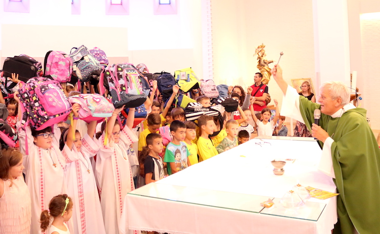 La benedizione degli zainetti, durante la festa al Salice di Fossano nel 2018