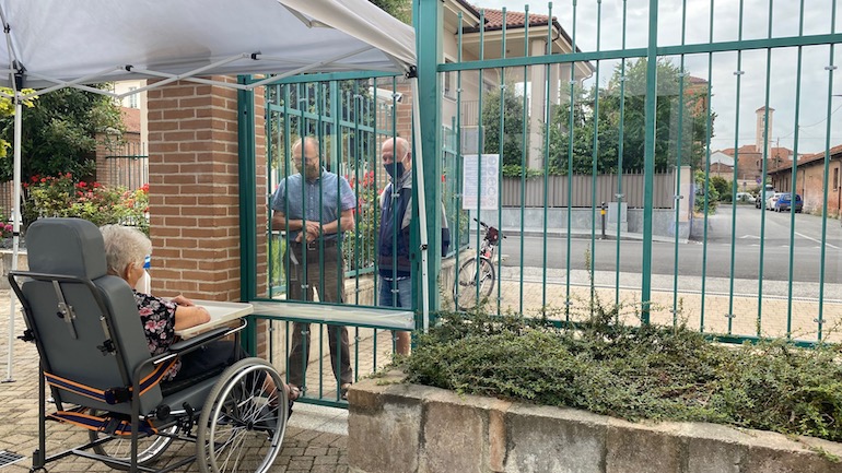 Da alcuni giorni c’è una nuova modalità per le visite al Sant’Anna. È sempre a distanza, ma questa volta all’aperto, in una piccola area verde che si affaccia su via Monviso. Qui i parenti possono sostare all’esterno e, separati da una divisore in plexiglass, incontrare i loro cari, su prenotazione, dopo aver preso un appuntamento.