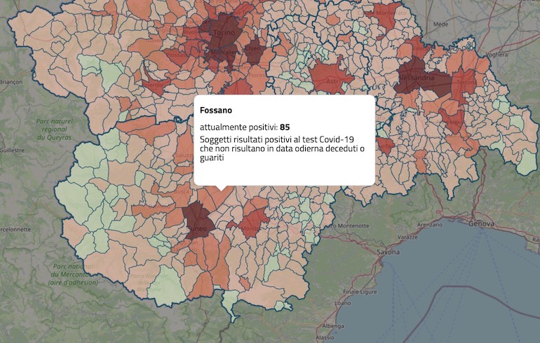 Attualmente positivi in Granda: Cuneo 395, Mondovì 179, Alba 112, Fossano 85, Bra 80, Savigliano 69, Saluzzo 53. Tra i piccoli centri del Fossanese segnaliamo Centallo 22, Villafalletto e Bene Vagienna 13, sotto le 10 unità gli altri comuni.