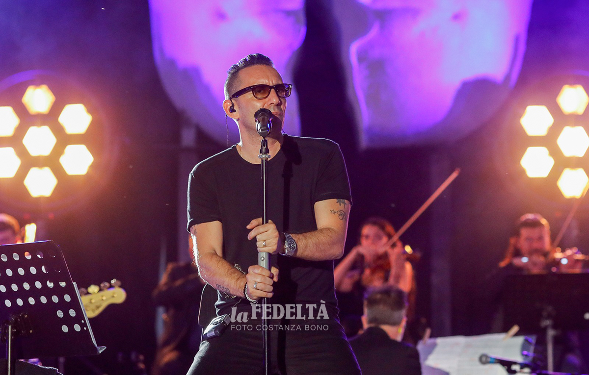 “Chi ha realizzato questo posto ama la musica! Siamo in mezzo al nulla, ma in realtà siamo in mezzo a tutto, alla bellezza!” con queste parole Kekko Silvestre, il frontman dei Modà ha esordito martedì sera all’Anfiteatro dell’Anima di Cervere nel concerto che ha dato il via all’edizione 2023 di Anima Festival, la kermesse musicale ideata dai fratelli Ivan e Natascia Chiarlo nello splendido teatro all’aperto sulla collina di Grinzano. Un inizio col botto, sia per la folla presente ad applaudire la band (che in questo tour è affiancata da un’orchestra, che impreziosisce ulteriormente lo spettacolo), sia per il bel clima di scambio e di empatia con gli artisti. Kekko, vero mattatore dello spettacolo, non è soltanto autore e voce importante. Nello spettacolo è stato anche cicerone di un viaggio che ha accompagnato il pubblico lungo oltre vent’anni di musica del gruppo. Tra aneddoti simpatici, momenti emozionanti, storie personali. Mettendosi a nudo. E così il cantante riesce a passare da momenti leggeri e simpatici, dagli sketch con il pubblico delle prime file al momento in cui invita due fans sul palco e canta con loro, dalle battute sul propoli da prendere ogni 4 canzoni per mantenere la voce pulita e potente, fino a quando racconta della depressione, del mal di vivere e di quanto sia complicato uscirne. “Devo dire due grazie – racconta – uno a me stesso per essere uscito da un brutto periodo (e invita tutti a “dirsi grazie” ogni tanto e prendere in mano la propria vita) e poi grazie a voi, che siete la medicina migliore!”.