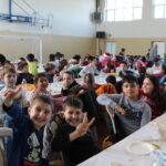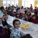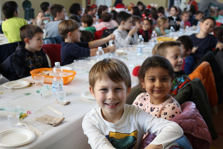 Martedì 19 dicembre, tutti i bambini, i ragazzi, le insegnanti e il personale delle scuole di Trinità (oltre quasi 400 ospiti) dalla Materna alle Medie ((i piccoli delle Mille bolle sono stati serviti nella sede del micronido) hanno preso posto alle tavole imbandite nella palestra comunale trasformata per l’occasione in un ampio ristorante pronto ad accogliere il pranzo di Natale.
