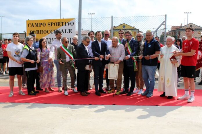 È stato presentato nel pomeriggio di oggi (sabato 7 giugno) il rifacimento dell’impianto sportivo di strada Oreglia a Bene Vagienna. La struttura parrocchiale, dedicata a papa Giovanni XXIII e affidata al Comune con la formula del comodato d’uso gratuito per trent’anni, è stata profondamente ripensata: nuovo il campo da calcio (ora in sintetico) con lo spogliatoio, spostato l’ingresso dal lato di strada Oreglia a quello perpendicolare. La spesa è stata “coperta” tramite il bando “Sport e periferie”, a cui il Comune ha candidato il progetto.