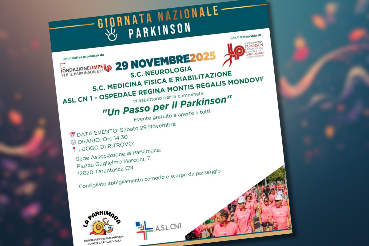 Il 29 novembre, in occasione della Giornata Nazionale della malattia di Parkinson promossa da Fondazione Limpe per il Parkinson Onlus e da Limpe-Dismov Ets, le strutture di Neurologia dell’Ospedale Regina Montis Regalis di Mondovì e la Medicina Fisica e Riabilitazione dell’AslCN1 promuovono l’evento "Un passo per il Parkinson".